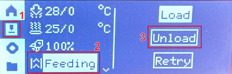 Confirm that the printer is not paused or errored. If all is clear, manually unload the filament by using the directional buttons and selecting the Nozzle icon (1), then the "Feeding" option (2), and finally selecting "Unload" (3) from the final menu.