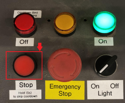To turn off the laser cutter, exit the software and press the “stop” button to turn off the machine (see picture on right). A red button will flash while the bulb cools. Note: do not hold down the stop button when you turn off the machine.